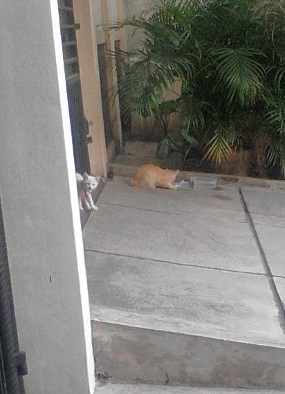 Masih ngeliatin temen ane, minta ditolongin. makanannya malah dimakan kucing lain gan.